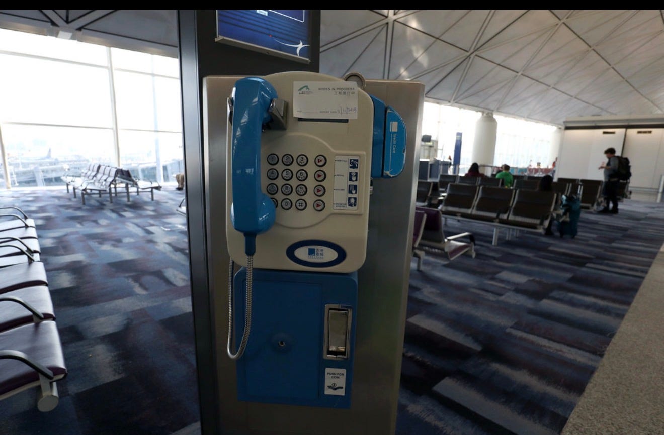 This time I’m standing in the terminal like I just got there. Brown carpet worn dark in the traffic lanes. The kind of airport where nothing looks dirty exactly, just tired. Dead pay phones bolted to the wall. Real ones. Clouded plastic. Scratched metal. Dust in the mouthpiece holes. They smell like old coat pockets and stale copper and hands that waited too long. The lights overhead make everybody look a little sick or a little guilty. Maybe both.